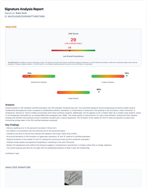 VeriMarx analyzes autograph signatures using AI technology to identify potential forgery indicators. Each submission includes a Comparative Analysis against validated reference signatures, presented in an easy-to-understand report.